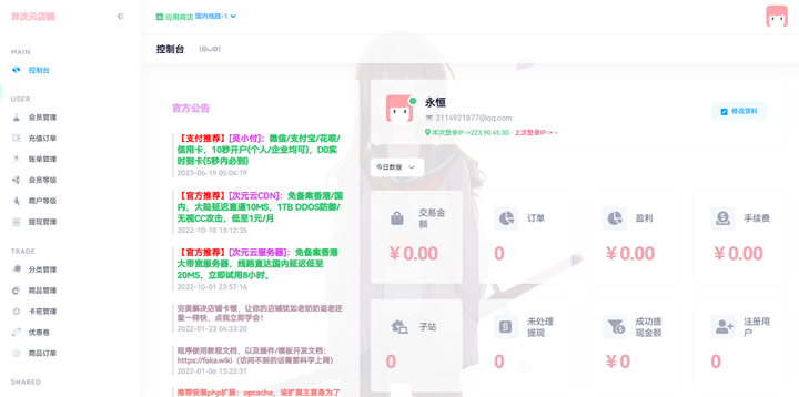 异次元店铺系统乃荔枝店铺系统3.0完全从0代码的重构版本,原生php开发,数据库底层使用Eloquent ORM,模板渲染使用Smarty3.1以及PHP原生渲染,会话保持全程使用session ,下面是简单功能介绍,还有更多细节无法一一介绍,需要你自己下载并安装才能体验。